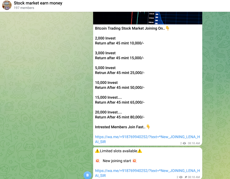 One telegram group name of “Stock market earn money” link was “https://wa.me/+918769940252//?text=*MONEY-INVEST-SIR*%E2%99%A5%EF%B8%8F” is there. It was totally fraud..In this group showing fake proofs. Peoples don’t invest the money in this group. They are all scam…