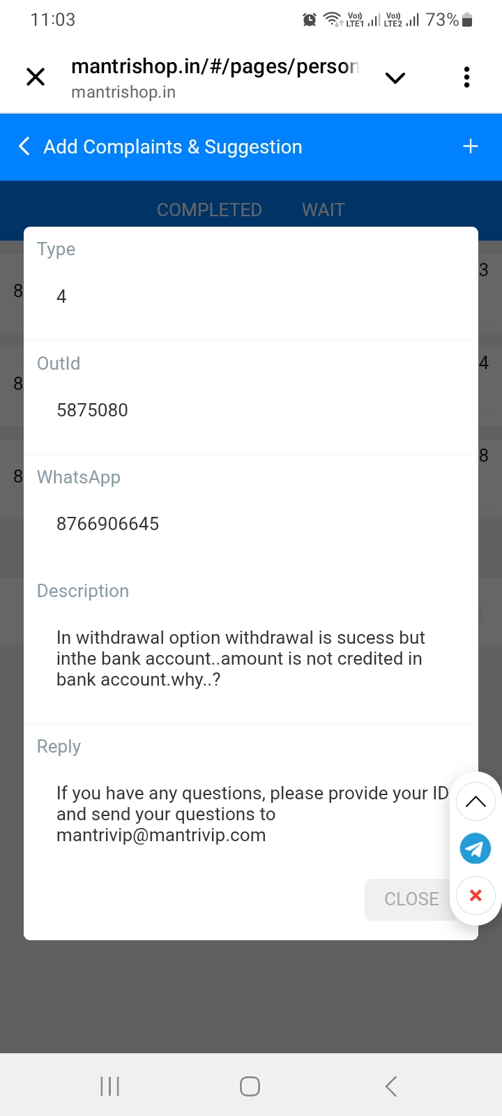 I msg his telegram bot but no response also i complaints & suggestion but it gives me sms please contact mantrivip@mantrivip.com…but there is no use…
