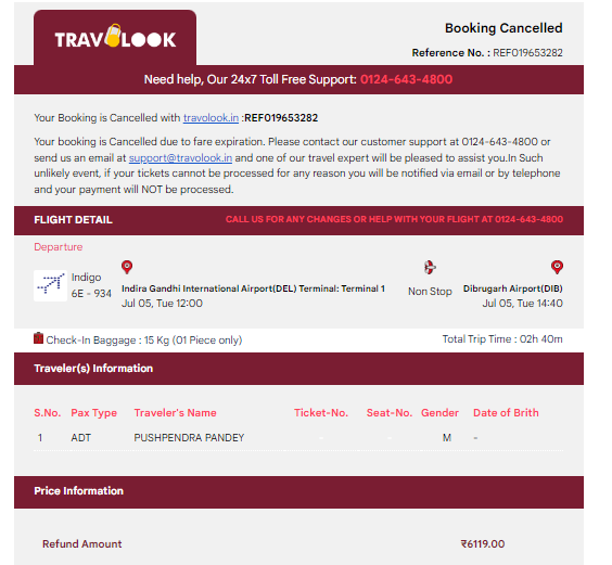 I Have booked a flight from delhi to dibrugrah at 16th june 2022 from TRAVOLOOK.IN with booking reference no. REF019653282. just after payment succesfull mail, i got a mail of ticket cancellation due to price variation.ii that mail they mention my full money will be refunded with in 10-15 days. but till date 12/08/2022 they did not refund my money . they are not replying any mail(mail id not availbale) their customer executive told only to wait for one more week. i am very frustrated by this fraud. i am waiting for money since last 7 week .