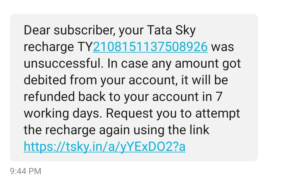 was successful and also got that msg too, but That rs 250 was not credited to my Tata Sky Account. Then I Called Your customer Care for help ,they informed me that recharge was un-successful at Tata sky’s end and as Rs 250 was deducted for un-successful transaction ,it will be refunded back to my account after 7-10 days.