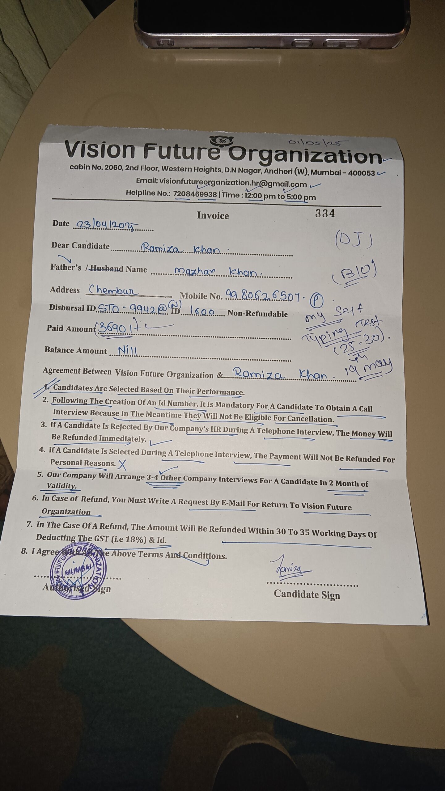 I am Miss Ramiza Khan I had applied on naukri app for data entry job and then I got message of interview in Dn nagar Andheri in western heights on 23 April 2025 they took interview they said I am selected and promise me to provide job . then they took an amount of 3690 and said if you did not like the job we will refund it and gave an agreement. they immediately gave me QR code and told to pay the amount and I have paid the amount.then she told me from 19 may 2025 my training will start she have given completely opposite job 2 times . I called the helpline number and asked for refund on 29 may 2025 she told you will get call from refund team I was a lie she told to me i wait for the call and on 2 july she told me to write an email for refund to the company’s email id i wrote and waited for 3 days I got no reply now I told her I will give complaint she told rudely Okk you can