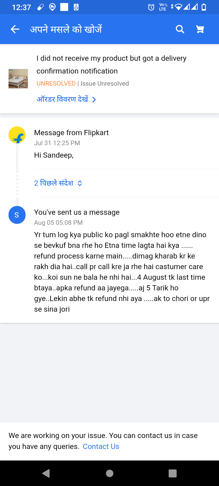 Flipkart se mene ak matters order Kia tha jiska price 7000 sumthing hai ..mene ye product 3 months ke emi pr order Kia tha Flipkart pay latter ke throw …28 August ko mene app main dekha to order deliver show karne lga..mene castumer care ko phone kia to Boone lga koi issue ho gya honga mujhe 11 din se upr hone bale hai main regular castumer care ko phone karta hu ..lekin mera refund abhi tk nhi mila or meri emi jo thi first usme payment karne ko or panelty dhukha rha hai…main Etna bhe pagl nhi ke payment bhe kr du…mujhe 11 din se pagl bna rkha hai Flipkart ke castumer care balo ne investigation chal rhe hai bol kr…4 August last time tha wo bhe nikal gye uske bad bhe mujhe pareshan kr ke rakha hai main inlogo ko phone he karta rhu kya Etna time west hota hai mera upr se meri prblm ko hal nhi kar rhe hai ..11 din se upr hone bale hai… esliiye mujhe majburan complaint karni pd rhe hai…mera nam Sandeep Chauhan hai pH no 8287178486