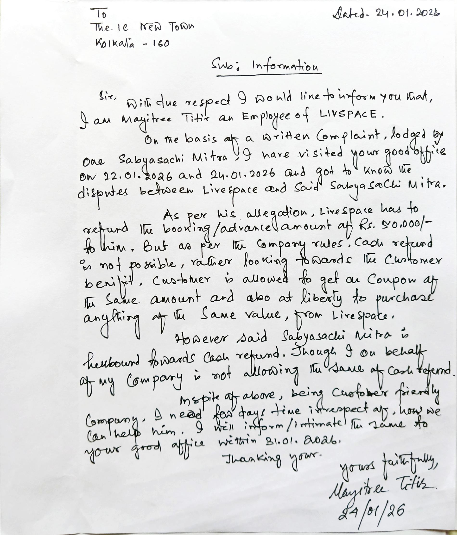 The NEWTOWN PS summoned the LIVSPACE team on 22.01.2026. . They wanted to have a face to face discussion with me ( i.e., with the customer / client ) . . Accordingly , the P S called me on my phone to find a mutually convenient time . . I agreed to visit the PS to meet the Livspace team on 2 4 . 0 1 . 2 0 2 6 . . Hence, I reached the NEW TOWN PS on 24th JANUARY 2026 around 11 am . .