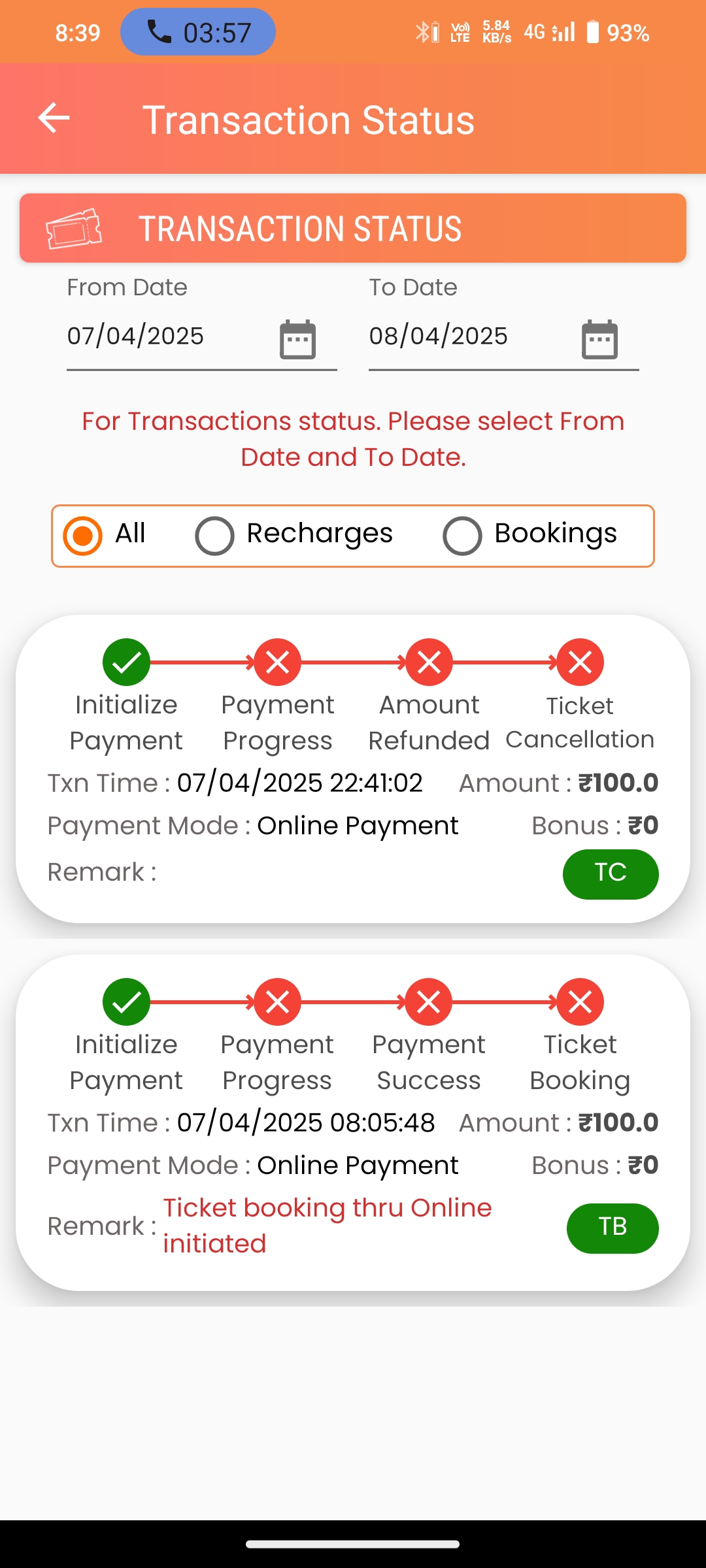 My amount is debited but not received ticket I am ticket booked on 07/04/2025 but still now not received ticket and no refunded