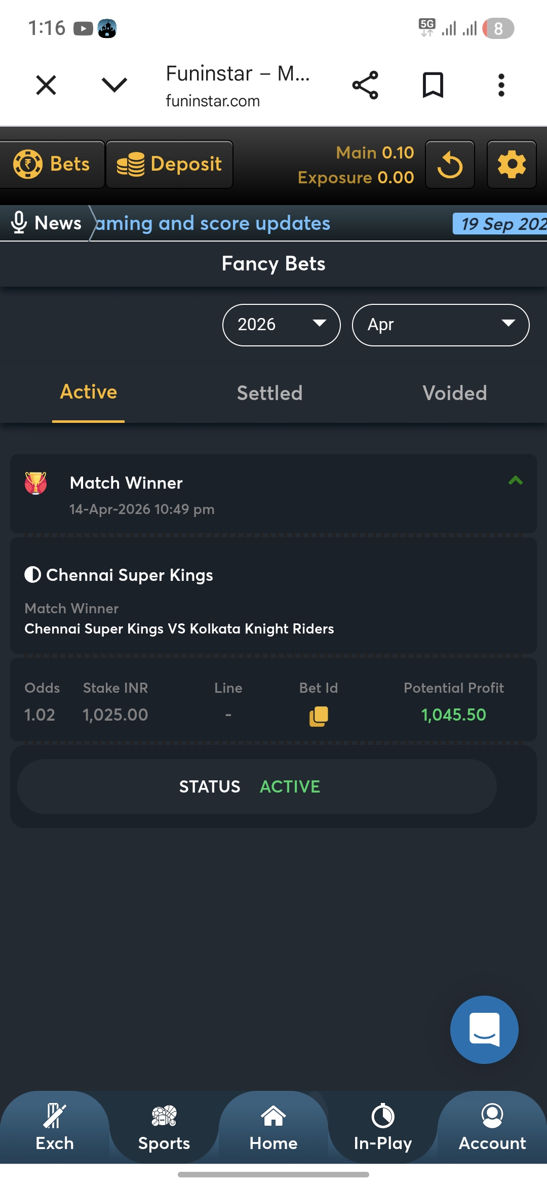 I placed a bet on fancy bet and u won the game but in id still showing active in fancy bet after I won match 12 hours ago still that’s showing active