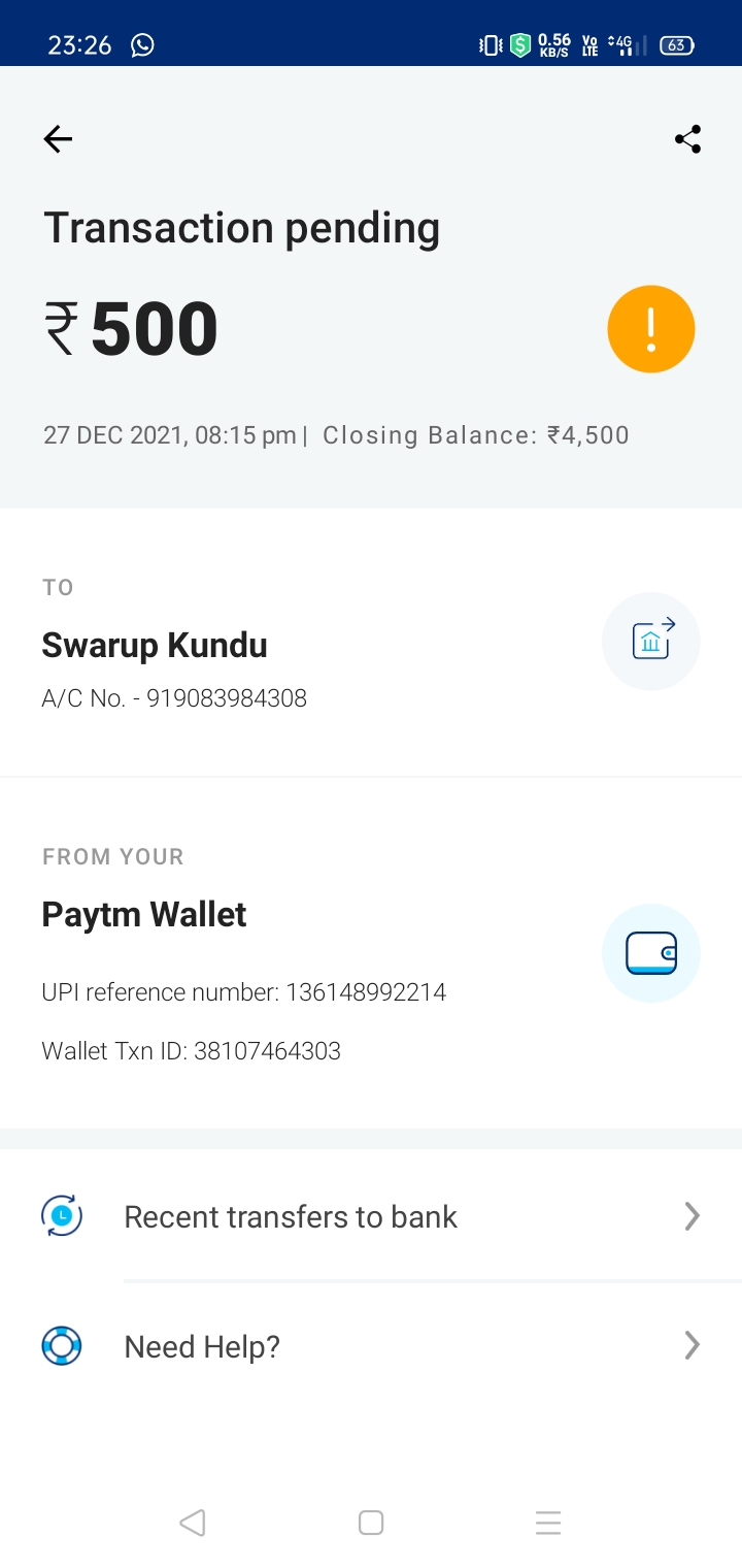I made 2 payments of 5000 and 500 from my paytm wallet to paytm payment bank. It status showing pending and the money debited from my wallet and not received in my payment bank .it is very urgent. I have pay my school fees