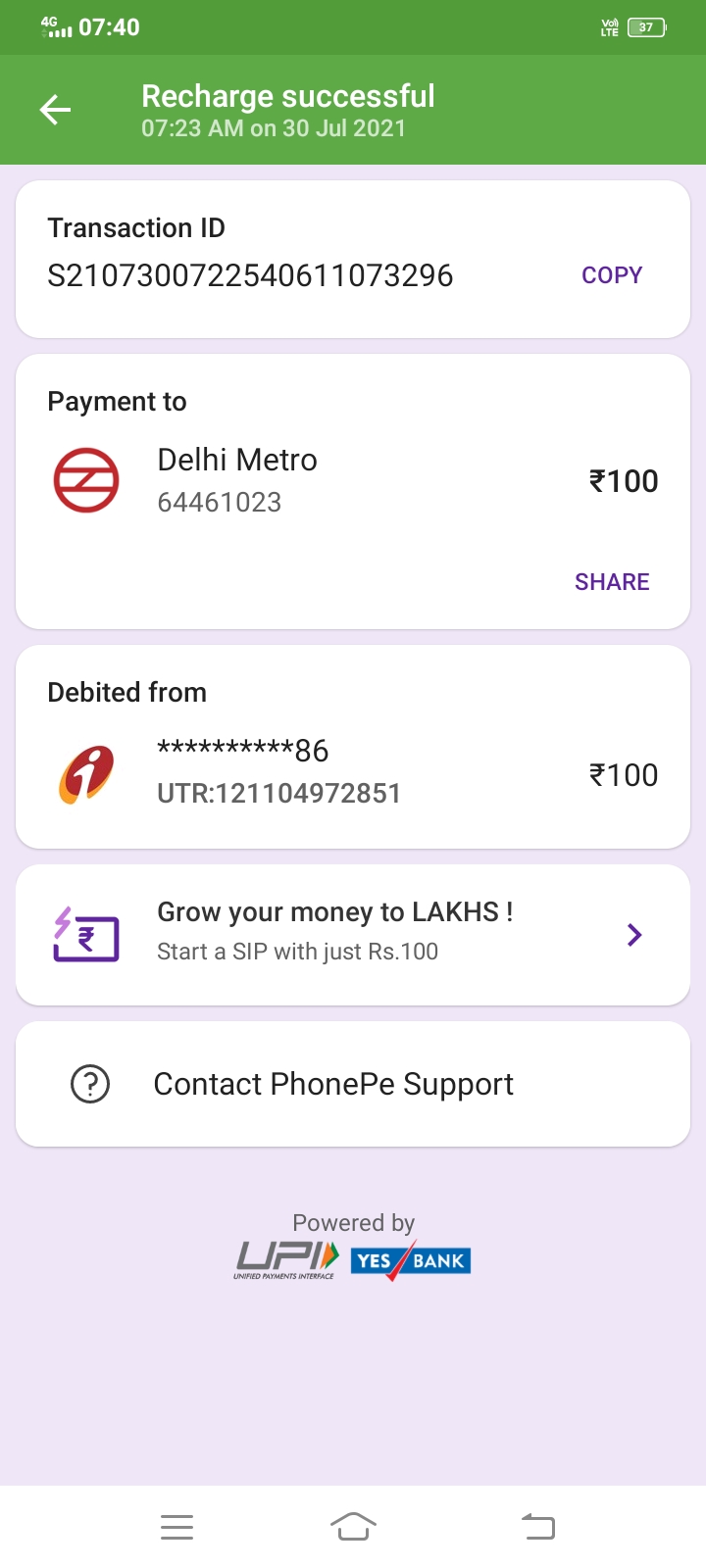 30 July 2021 I rrecharged my dmrc mobile but money not creadit in my card