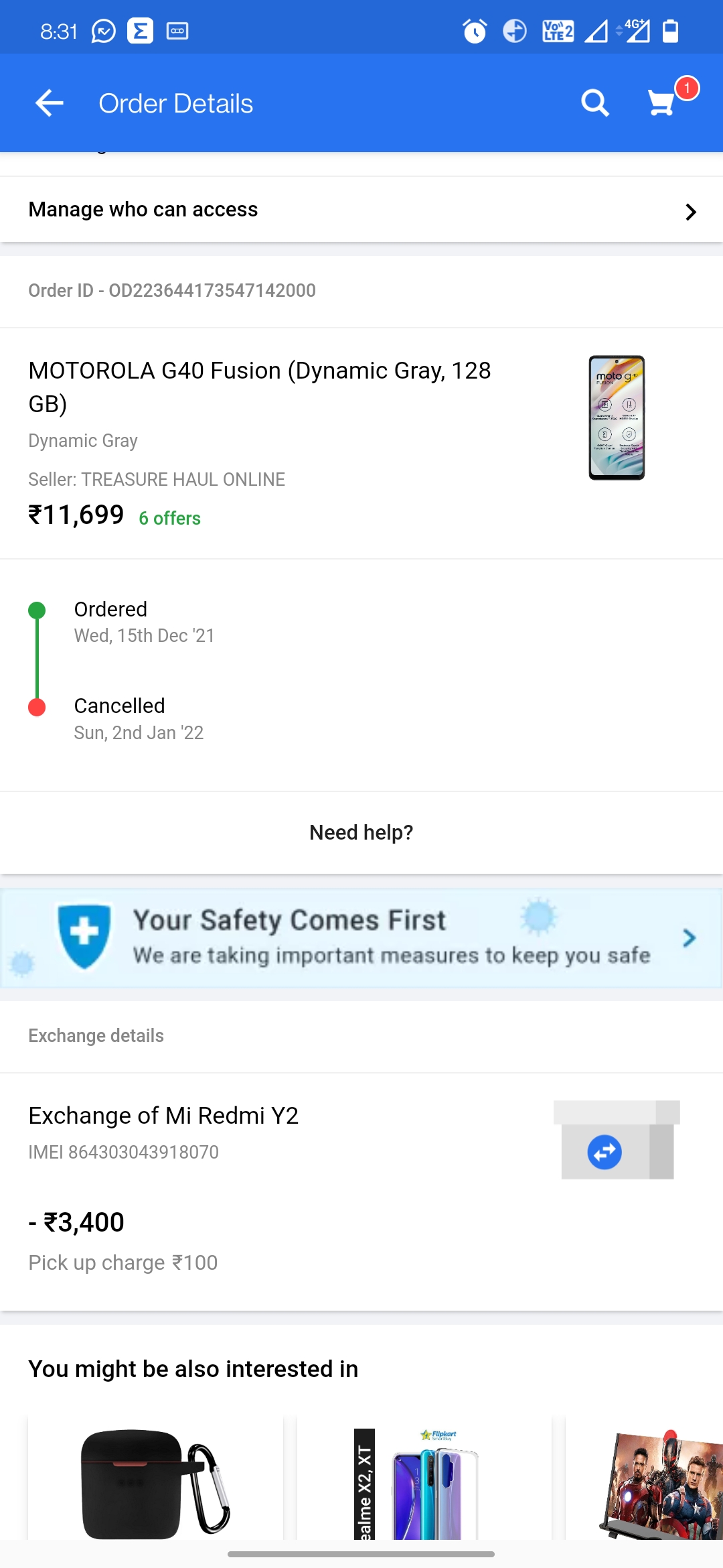 I have order “MOTO g40 fusion 128gb”on 15 dec 2021- the product received at the nearest delivery hub on 18 – dec 2021- and still 1st jan 2022 the delivery was not attempted – on 2nd jan 2022 i got a message tha the product was cancelled .I have waited for the product for more than 2 weeks and the last update was the delivery was cancelled – so I didn’t cancelled the product -the flipkart team cancelled by their own