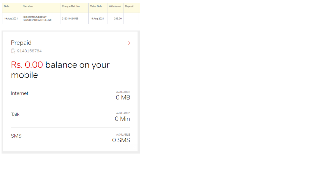 My Airtel mobile number is 9148158784, Today I rechanged my mobile from the Airtel site using Netbanking. My payment got deducted, but Unfortunately, the payment was not updated on the Airtel site.