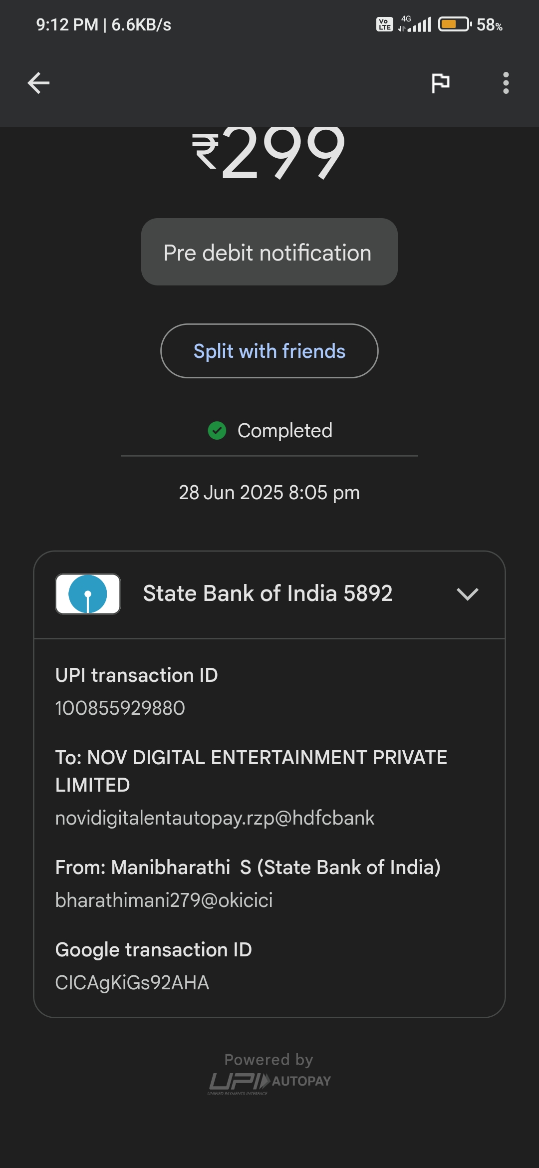An amount of Rs.2999 got debited from my account on 29-july-2025 @9:05pm, claiming that it is autopay, from my UPI account. It says UPI-NOV DIGITAL ENTERTAINMENT PRIVATE LIMITEDM. novidigitalentoutopay.rzp@hdfcbank. I did not activate any autopay from this account. It is a scam.Thank you