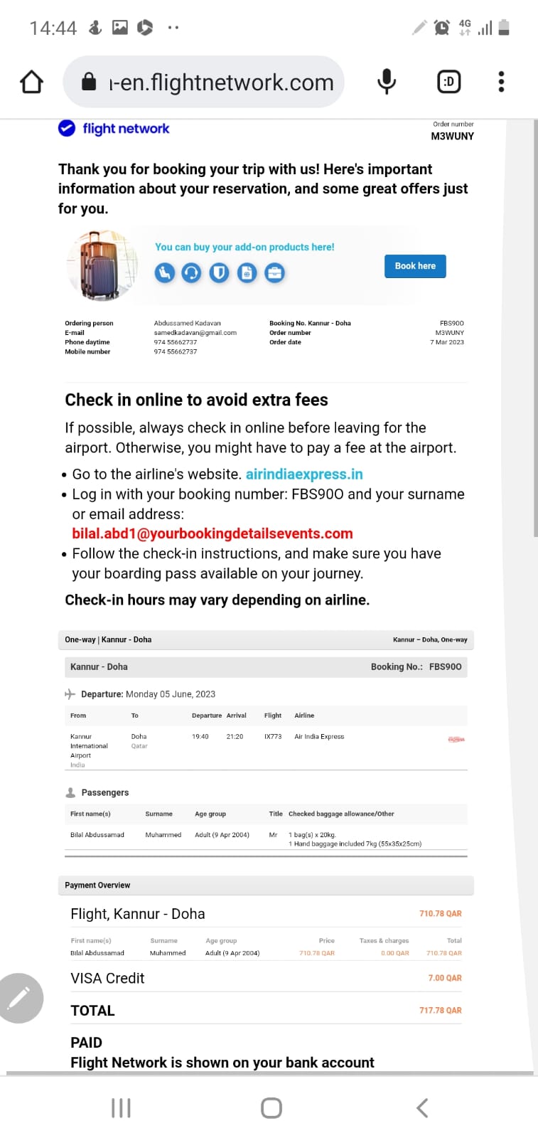 1. Booking confirmed for AirIndia Express ticket for my son Mr. Bilal Abdussamed through Flightnetwork, travelling from CNN to Doha, Qatar (PNR FBS90O), on 05/06/2023.