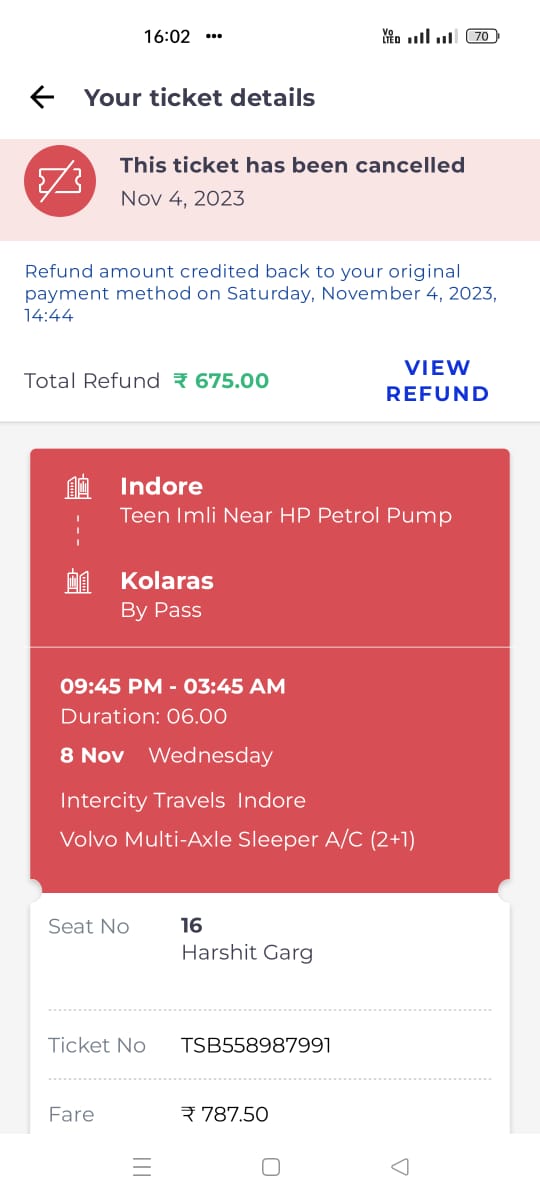 My ticket was cancelled by the bus operator because the ticket price has become much higher than before when I booked this ticket (09-10-2023) when the price of this ticket was Rs 675, now it has increased to Rs 1890 (04- 11-2023) I am a 17 year old student. I was returning home on Diwali festival and this fraud was done to me and now I am not capable enough to pay such hefty prices now I have to celebrate festival aLoan.