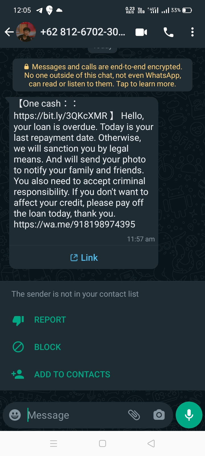 One cash 【One cash::https://bit.ly/3QKcXMR 】 Hello, your loan is overdue. Today is your last repayment date. Otherwise, we will sanction you by legal means. And will send your photo to notify your family and friends. You also need to accept criminal responsibility. If you don’t want to affect your credit, please pay off the loan today, thank you. https://wa.me/918198974395
