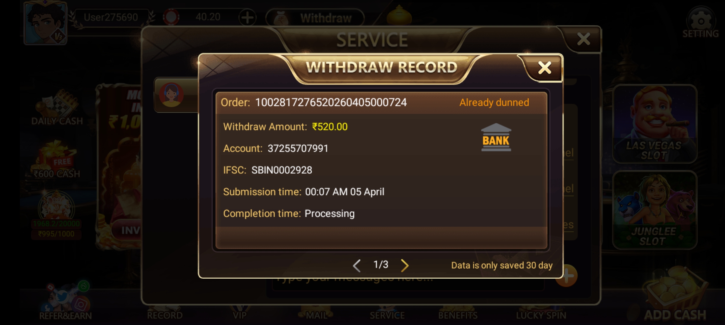 I withdraw my money on 5 April 2026 and it’s more than 5days or it say already dunned but my money not received.No online customer service help.