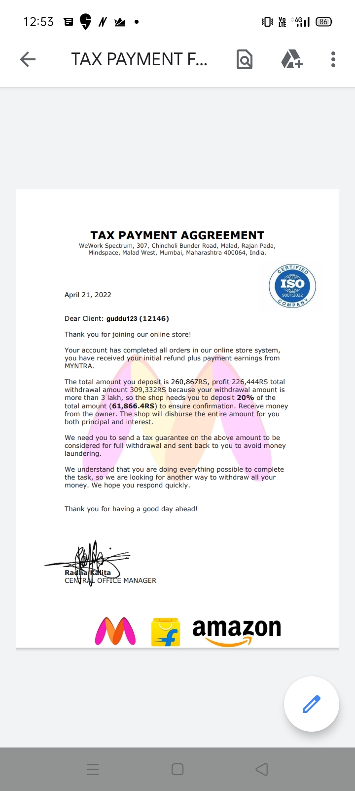 There is a website called Myntra merchant center.They are telling we will have to pay money and in return they will give 50 percent commission as bonus.I have paid 260000 rupees in their different account.Now they have blocked me.