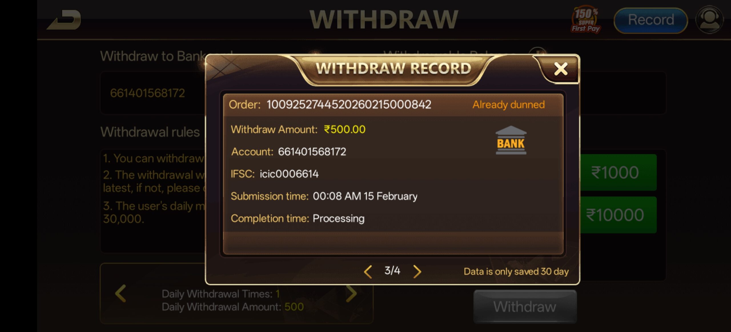 Hello dear team maine 3 withdrawal lagaya tha jismein se ek bhi withdrawal nhi hua hai status already dunned show ho Raha hai 500×3 withdrawal lgaya hai please resolved it