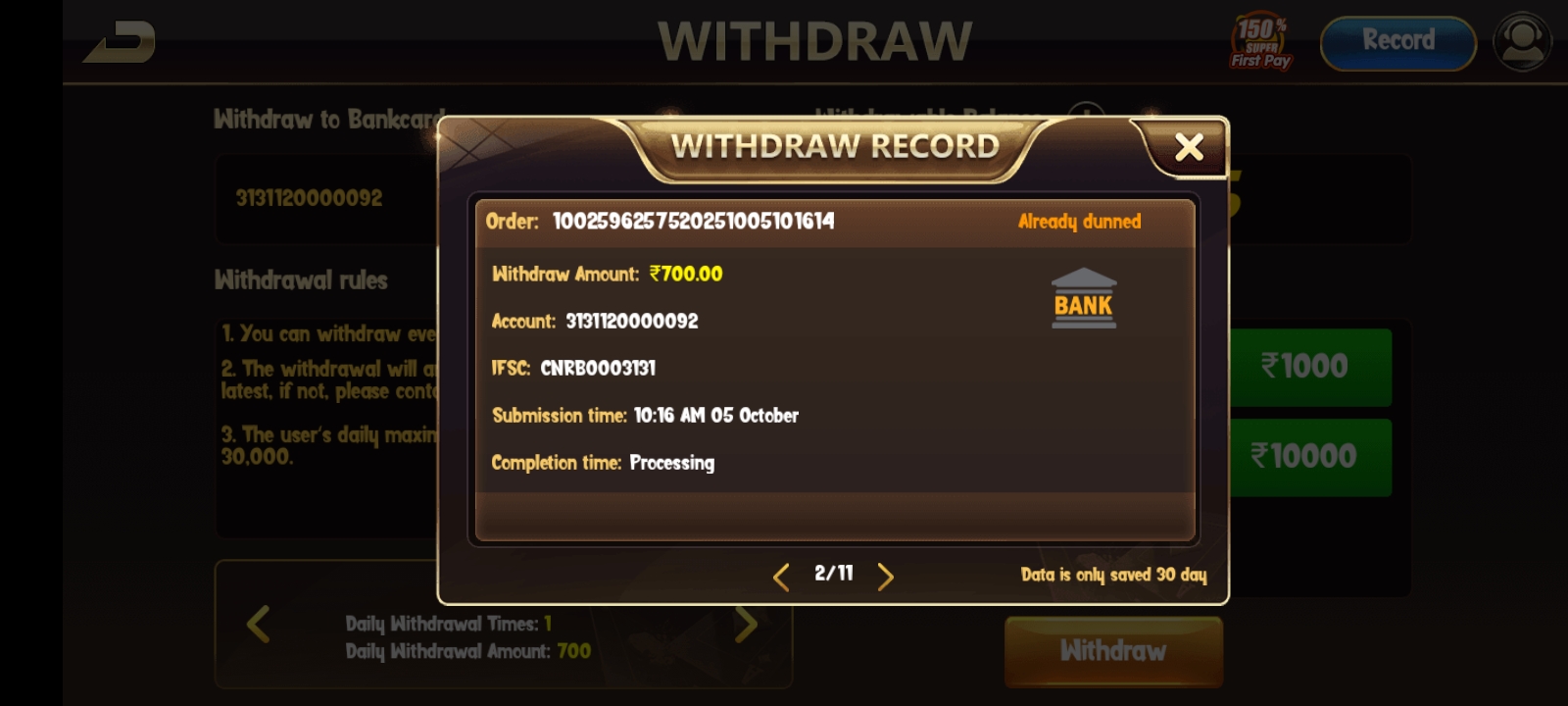 I set withdrawal for my in namaste teen patti but still I am not yet recieved my amount it is in already dunned for past 3 days