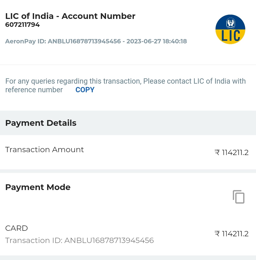 I made my LIC premium payment using Aeronpay Payments Application (Parent Company: AeronFly) on 27 June 2023.