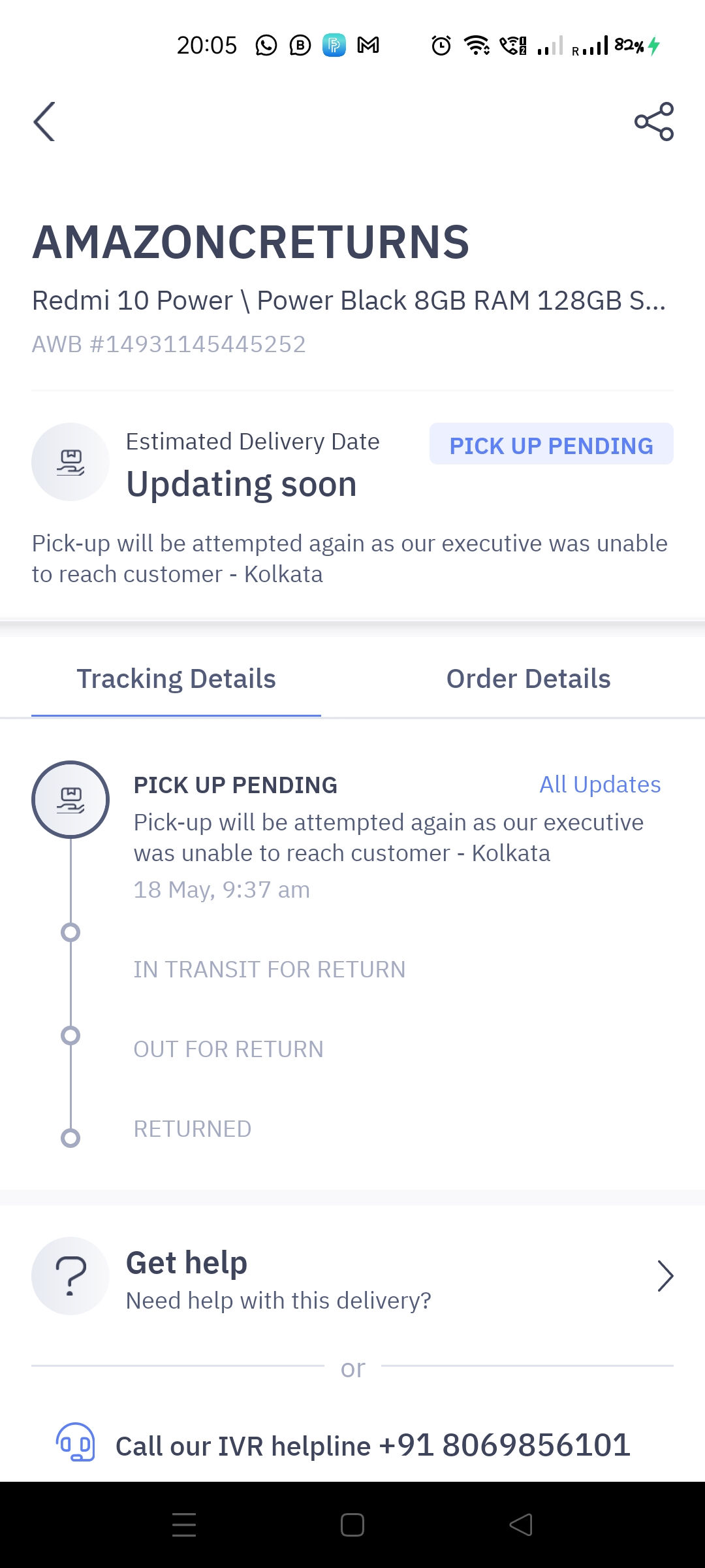 We applied for return . On 9th of May, return guy came to pickup but he stated quality checks were not resolved so he couldn’t direct pickup. We asked amazon to resolve quality checks . From that day onwards everyday I am receiving OTP for pickup. But they are not contacting and cancelling the pickup. everyday we are calling amazon customer care and delhivery customer care but nothing is solved. And pickup is not done yet.