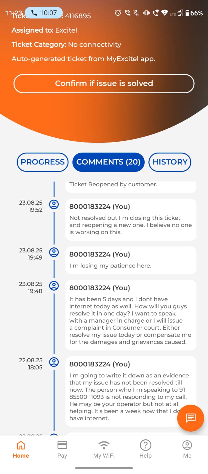 I had taken an excitel wifi connection . The payment was made for 6 months till 14-Nov-2025. The service provider interenet was disrupted on 19th August 2025 after which i requested a connection issue in their Excitel App. It was not resolved nor any refund was provided for the advance payment. when i raised a query multiple times, it was not resolved and i had to take a paycut as my work is fully dependent on the internet. I had to ultimately take another service provider connection and resume my work. I was refused services when i visited the offline store as well but to no avail as the person failed to recognise the issue and not refund me as well. Please take appropriate action and make sure i m refunded for the payment i have made already and not receiving any services on their part
