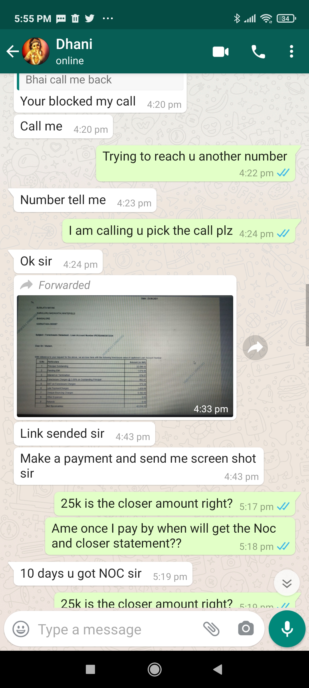 from then I am running behind prathap and his manager (Raghavendra) and his manager (agent3) ,they were passing ball to another till now ,today they are saying come to my office and pay another 5K to get the NOC .I have attached all proves including my call recording with my husband for the final amount which they confirmed but now they are threatening me for my NOC and misbehaving too. Please note that I am out of my job due to this pandemic last 1 year still I took other loan to close this because of prathap,Raghavendra and agent 3 were repeatedly behind me to close the loan and now all are playing around with me so please do help with my NOC ASAP.