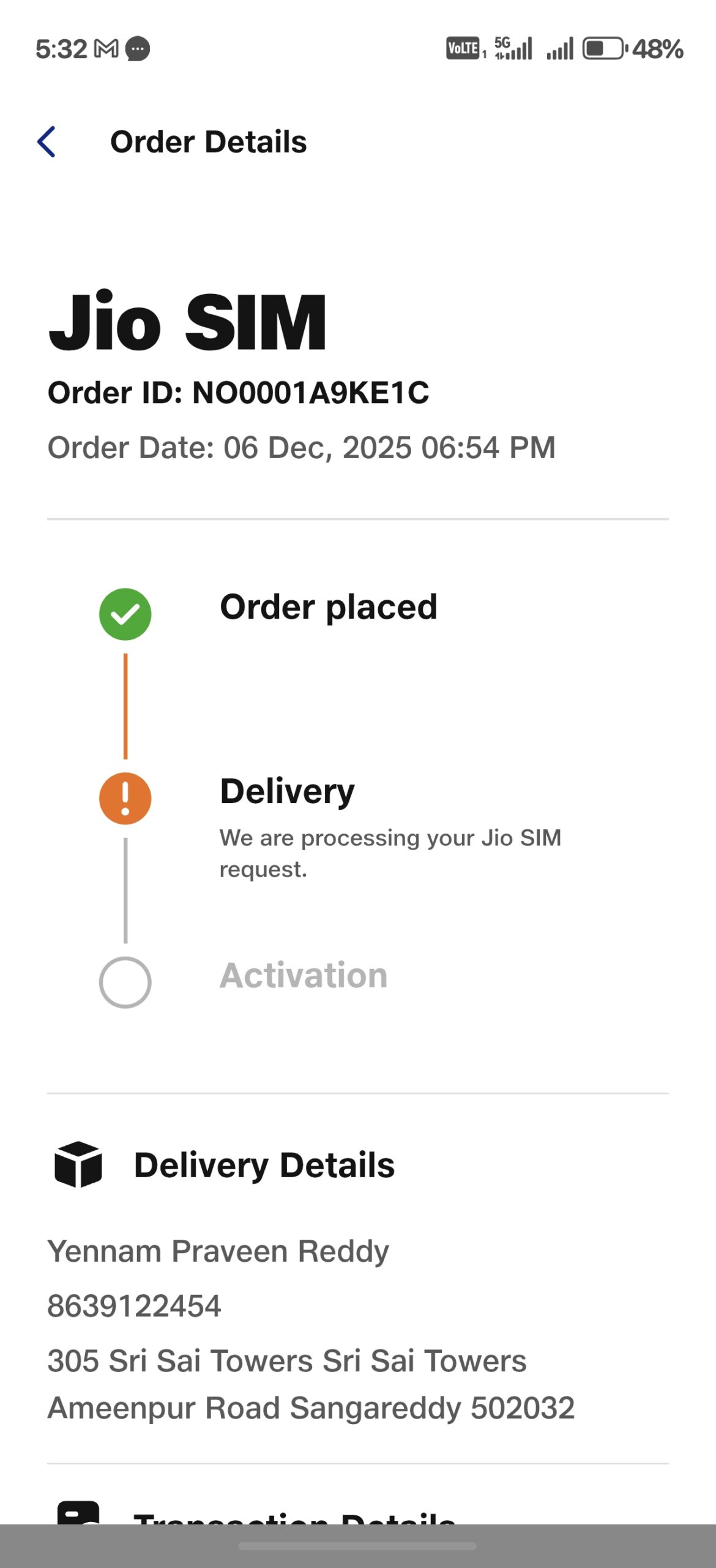 Despite several attempts to follow up, the SIM card has not been delivered even after 6 days. I contacted Jio’s customer care team multiple times and was falsely assured that the SIM would be delivered within 24 to 48 hours. However, I have not received any delivery or credible update.