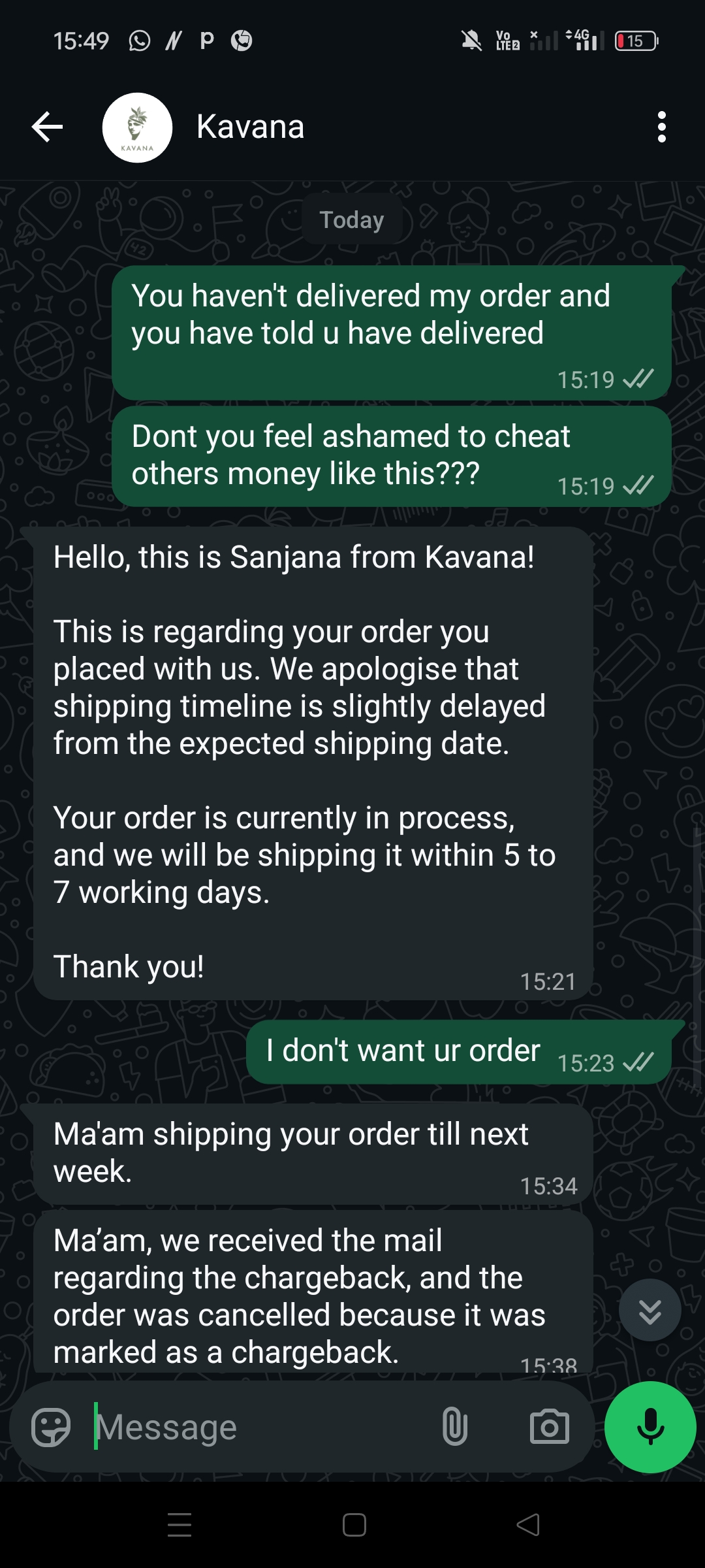 Placed a order on October 7th since the delivery time showed as 3/4 weeks waited for a month and contacted them after trying for few days they responded telling it’s in process and even after a week they told the same thing…I was quite frustrated coz already there delivery timeline was over and requested them to cancel which they didn’t agree stating it’s made to order and according to there policy they can’t cancel…isn’t the policy states that delivery will be don’t in 3/4 weeks?? On November 24th I msged them last where they again told me the same story and I complaint to amazon about it since I paid via Amazon pay balance and amazon helped me to give chargeback and gave me 14days time and today being 14th day I asked amazon for update and they told the merchant (kavana ) as told there bank that they have already delivered the product and hence they have cancelled the chargeback… So they can’t do anything and now I filed a cyber crime complaint …I immediately msged to kavana asking why they lied that they already delivered and they are telling it will be delivered this week….oh my god isnt so cheap??? Just to cancel chargeback they have lied that they have delivered the order I told them I don’t want there product and I’ll return even if I get it and have filed cyber crime complaint will file a fir in police station tomorrow