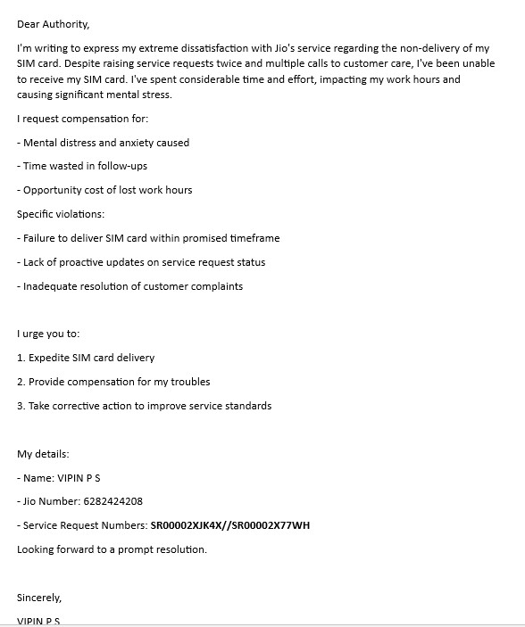 with Jio’s service regarding the non-delivery of my SIM card. Despite raising service requests twice and multiple calls to customer care, I’ve been unable to receive my SIM card.