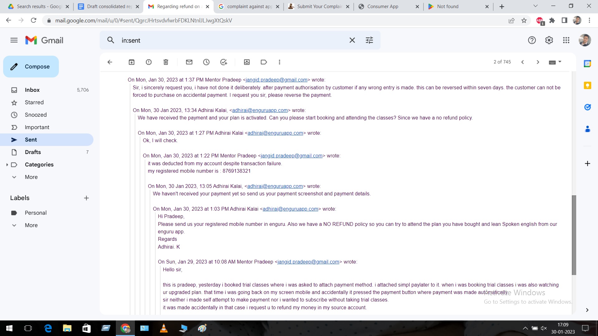 Sir i took trial classes from enguru app for that they required payment authorisation of Rs. 1 from any payment method. i took from simpl pay later and started trial classes. when i was watching their plan for upgrade then payment button on my screen pressed accidently and payment of Rs. 6000 deducted. i reported the same on time to company for accidental payment. When i mailed and spoke them on customer care. i was told for no refund policy which is against the purchase rules and authorisation of payment. when any wrong authorisation of payment is happened then it can be reversed in 7 days. now company denying me.