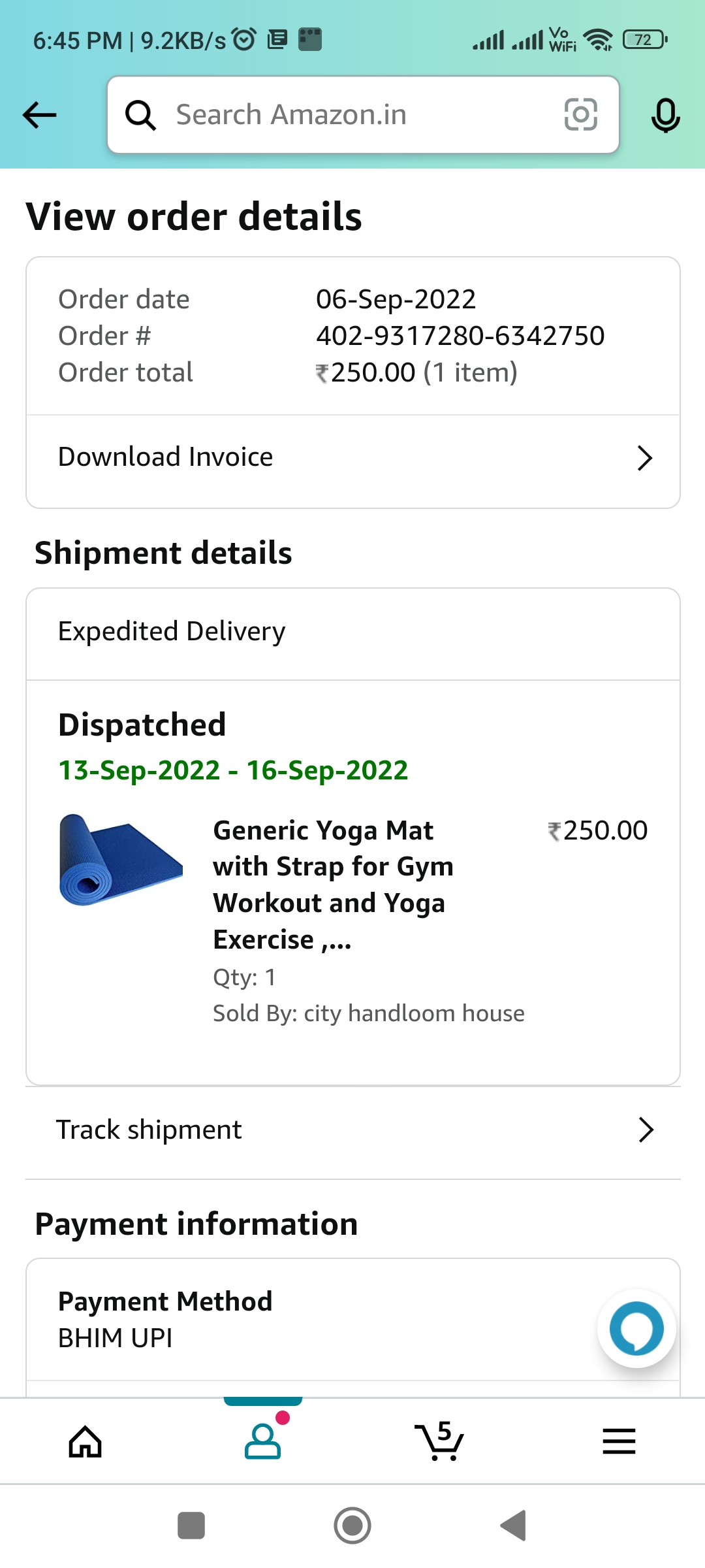 I had ordered a yoga mat from Amazon prize rps 250-/- which was already prepaid but the on the date of delivery was delivered from Meesho in COD and i was told that prepaid amount will be refund in your account I had complain for the same in meesha they it’s not their product and on Amazon it’s showing your product is running late