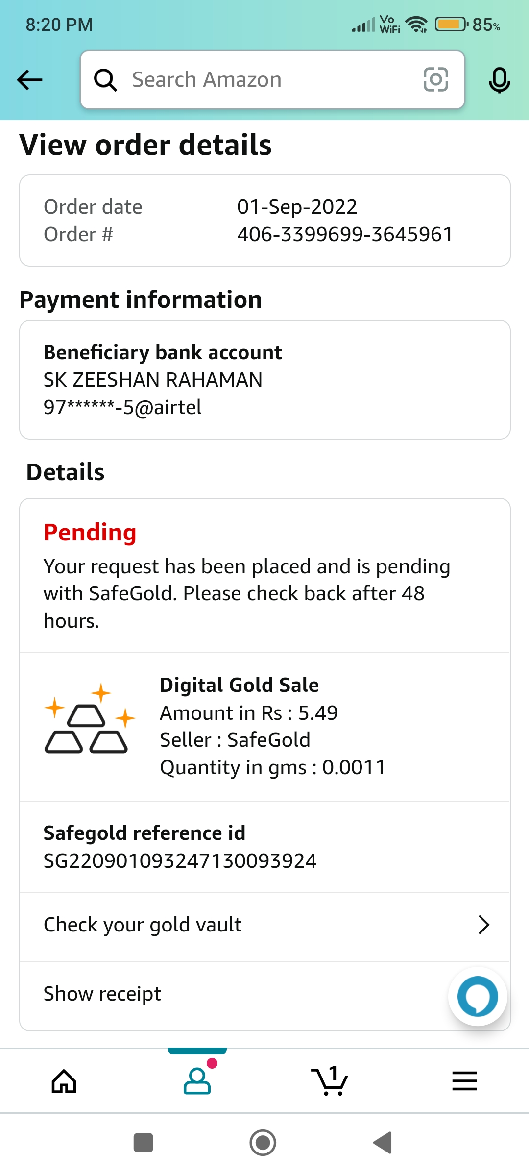 It’s been more than 48 hours for standard processing of transaction but still i have not been credited with the amount gold equivalent to 5.49 rs in my given upi id which i sold on 1st September 2022