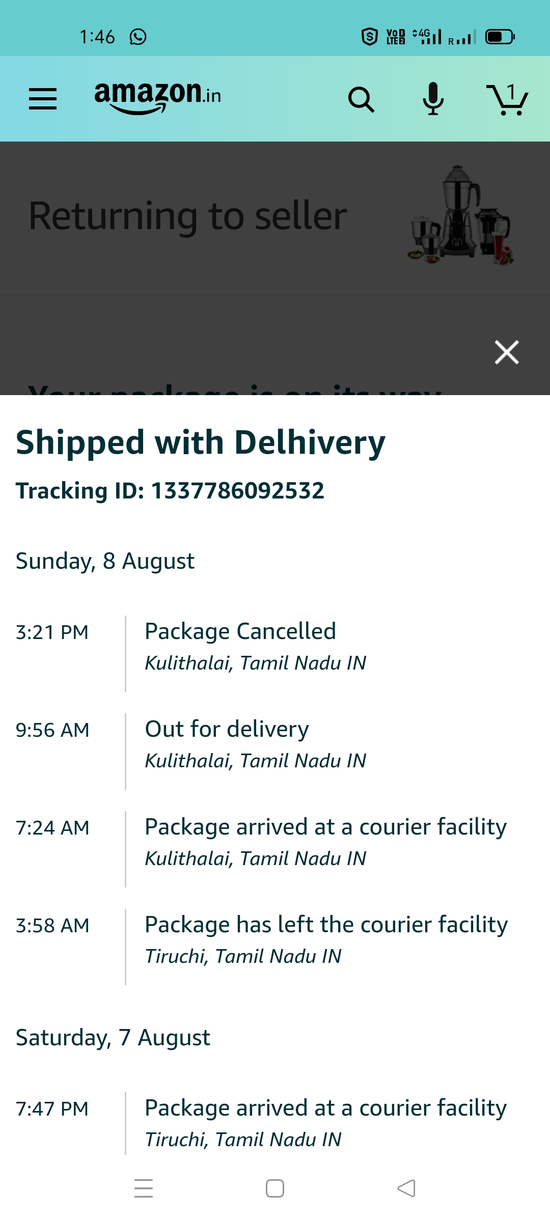 I Have ordered mixi in Amazon,after that it shown my order accepted and it will be delivered by 2-3 working days,then after a two days while iam tracking it shown like that it received to my near by home town and it will delivered by 10.am after that delivery boy called us for thrice but didn’t picked a call becoz of mobile in silence.. after that again we called back and while asking he said iam now in another place so today it’s not possible like that,and we asked it’s ok by tomorrow you can delivery it and he said yes .. but on that day it self in Amazon app it shown like its cancelled and resending to seller.. again we trying to delivary boy customer care didn’t picked a call and then we got call from customer care and they said you need product or what.. we said yes we need it.. they said by tomorrow you will receive it .by next day morning we are calling again they did not picked and again we called from another number they picked and said that sure we will delivery it but til eve 4.pm no response if we called also no proper answer they are cutting a call ,if whatsap the deatils and asked them also no response … It been worst response from Amazon .. we re not satisfied.. and didn’t cancelled anything but how without my permission can do it .