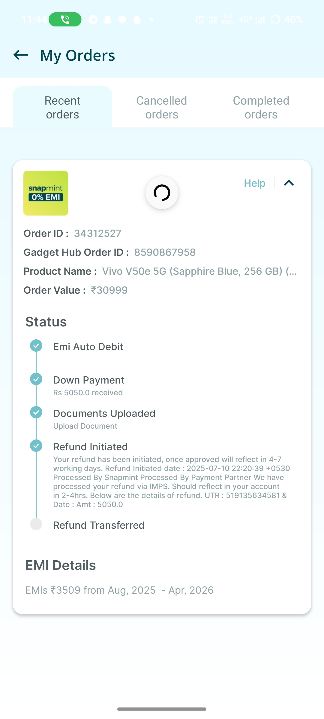 The booking time aprove the oder and i payed in downpayment 5050 then 5 min later automatic cancel order , after 2 day my refund cash not get