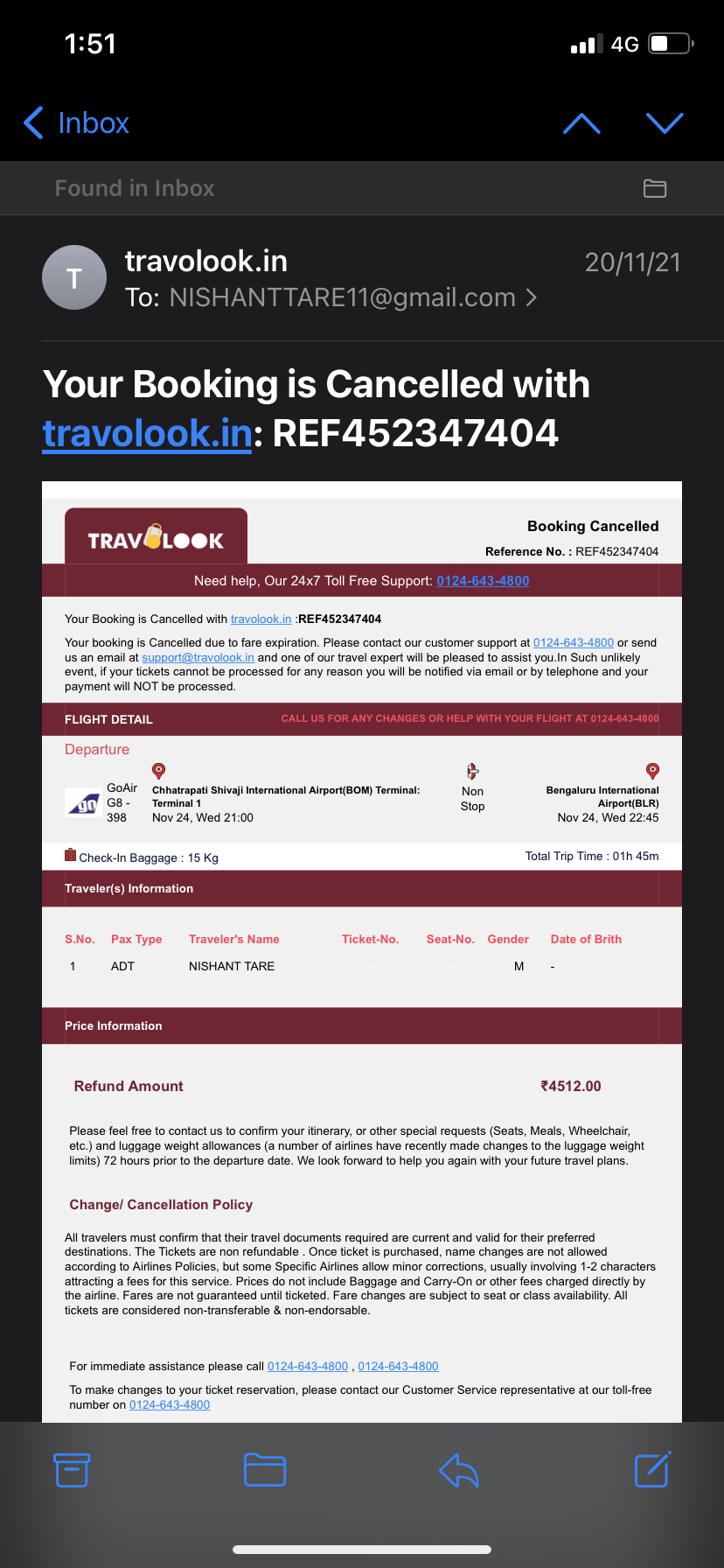 I have booked airline ticket on 20th Nov 2021 from Mumbai to Bangalore. After sometime it got canceled from TRAVOLOOK for some reason. When I spoke to customer care he assured me that I will receive refund in 6 to 7 working days. I have been waiting for refund since last 3 months.