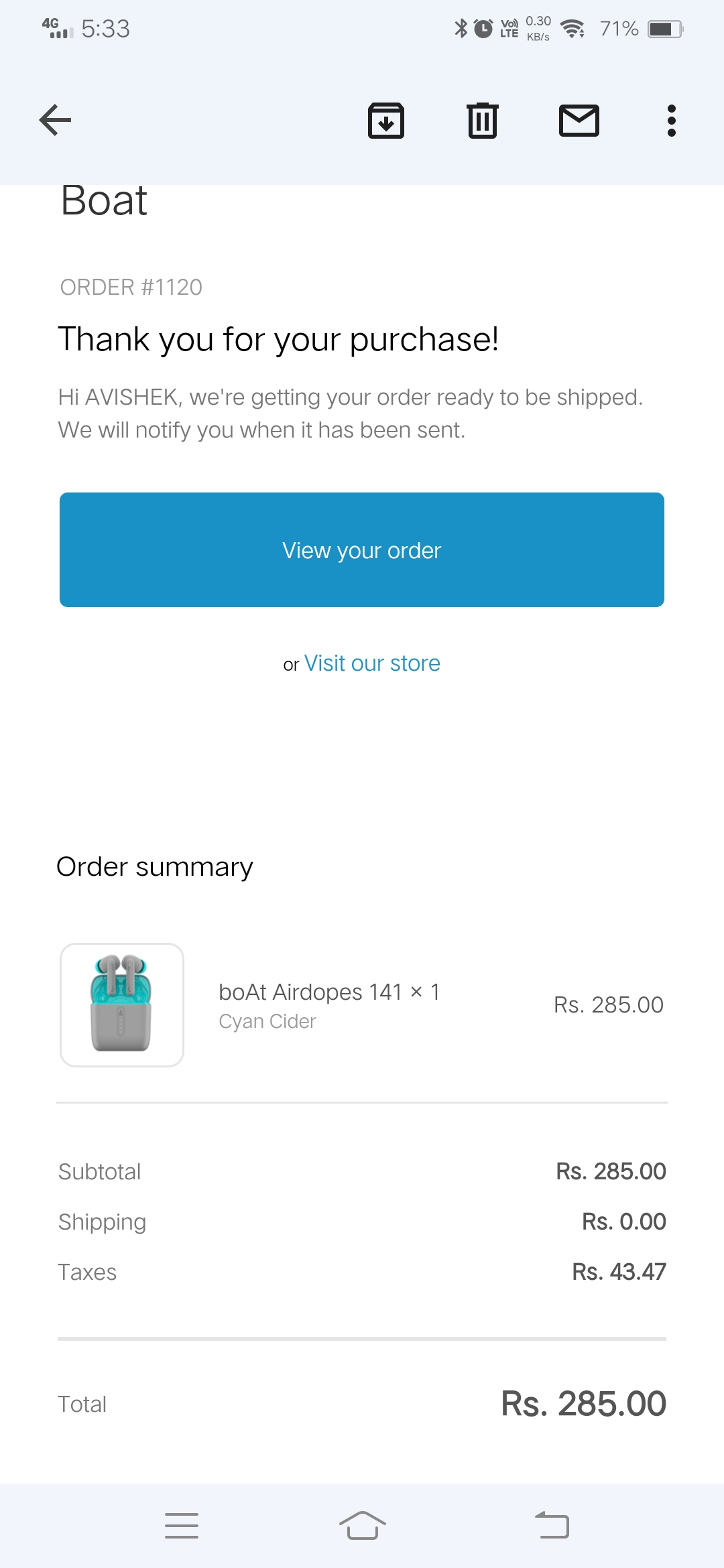 I ordered a set of boat airdopes and payed 285/-. I received a conformation email but I have not received the headphone till now.