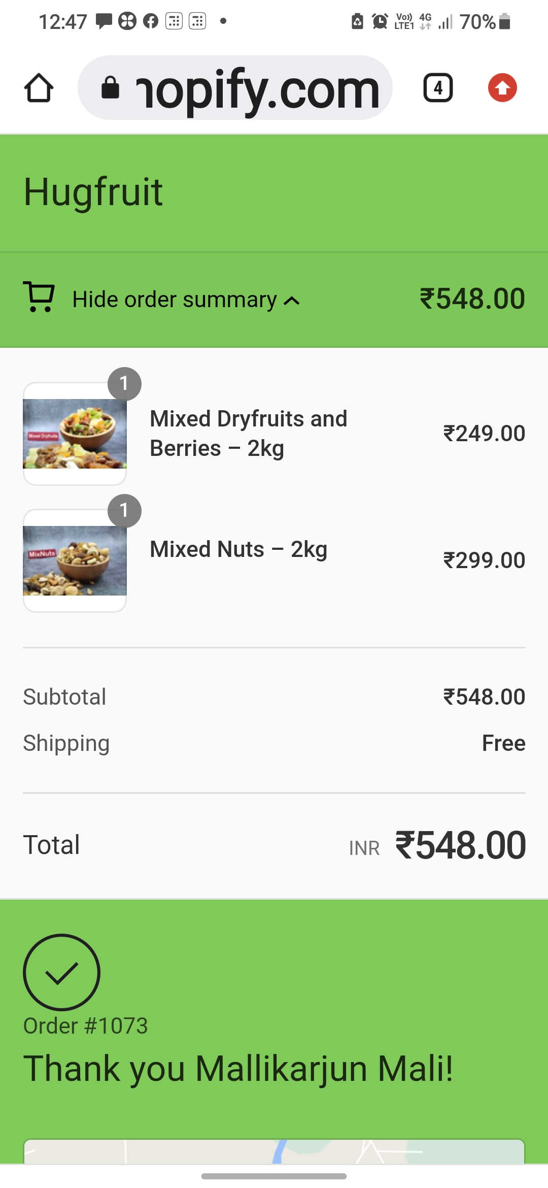 I had booked mixed nuts2 kg and mixfruit 2 kg to Hug fruit company.I paid amount 548 Rs. But till now I didn’t received product. My order number is 1073