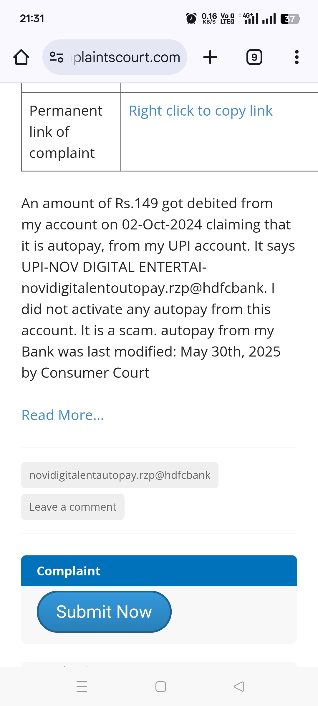| Name(s) of companies complained against | novidigitalentautopay.rzp@hdfcbank |