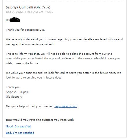 As an ola user, I wish to delete my account as its no longer required but Ola refused to do so. My concern is, If I change my contact number, anyone who will get my current number can login to ola with the OTP and can see my history or rides and personal details like home address and office address, email ID etc.