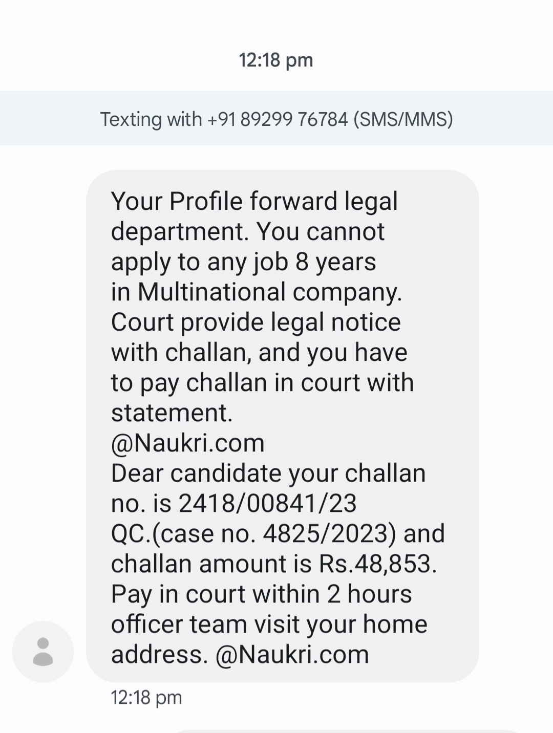Received a call stating that we are speaking from naukri.com your profile is forwarded to legal department, but we are here to help you and guide you as you are a fresher….after some time she connected the call with some other person who introduced himself as the legal advisor of naukri.com asking me to pay 9500 rs to avoid any court case against me. He also threatened me that if I failed to pay the amount now they will send police at my home address which may cause my defamation and I would not be able to apply in any multinational companies for next 8 years.