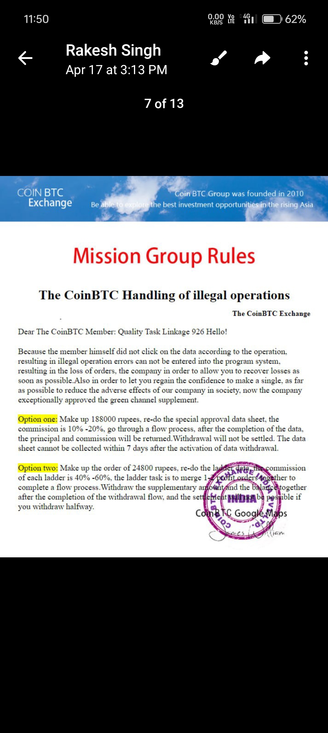 सर मुझे एक टेलीग्राम चैनल पर जोड़ा जाता है। जो कि पार्ट टाइम जॉब के नाम पे “Coin-BTC-Group” चैनल बनाए हैं जिसमें कुछ टास्क कंप्लीट करने के लिए कहते हैं जैसे किसी इंस्टाग्राम वीडियो को लाइक करके स्क्रीनशॉट भेजना। जिसको पूरा करने के बाद मुझसे अकाउंट डीटेल्स मांगते हैं और उसमें 180 rs. भेजते हैं। फिर इसके बाद टास्क 7 से 11 तक फिर किसी इंस्टाग्राम वीडियो को लाइक करके स्क्रीनशॉट भेजने के लिए कहते हैं। स्क्रीनशॉट भेजने के बाद प्रीपेड टास्क के नाम पे बहुत सारे प्लान दिखाते हैं। जिसमें हर प्लान अपने पिछले प्लान से महंगा होता था।