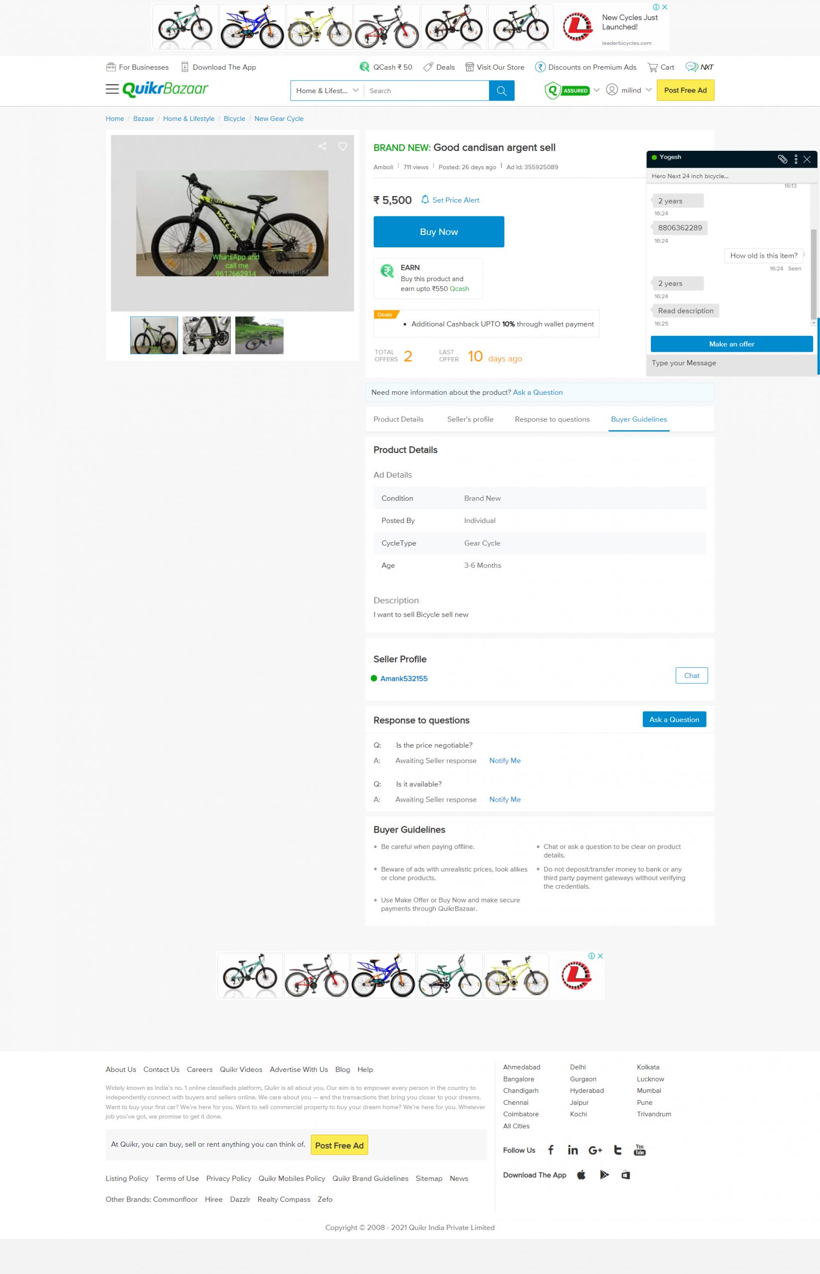 I found a person saile a bicycle prising 5500 rs on quicker dated 1.10.2021 at 5 to 6 pm, I send him 1250 rs by google pay, for delivery of bicycle, after some time he asks to send for 2199rs online, then and then I understand that its a fraud person but till I send him 1250rs too,his phone numbers are as follows
