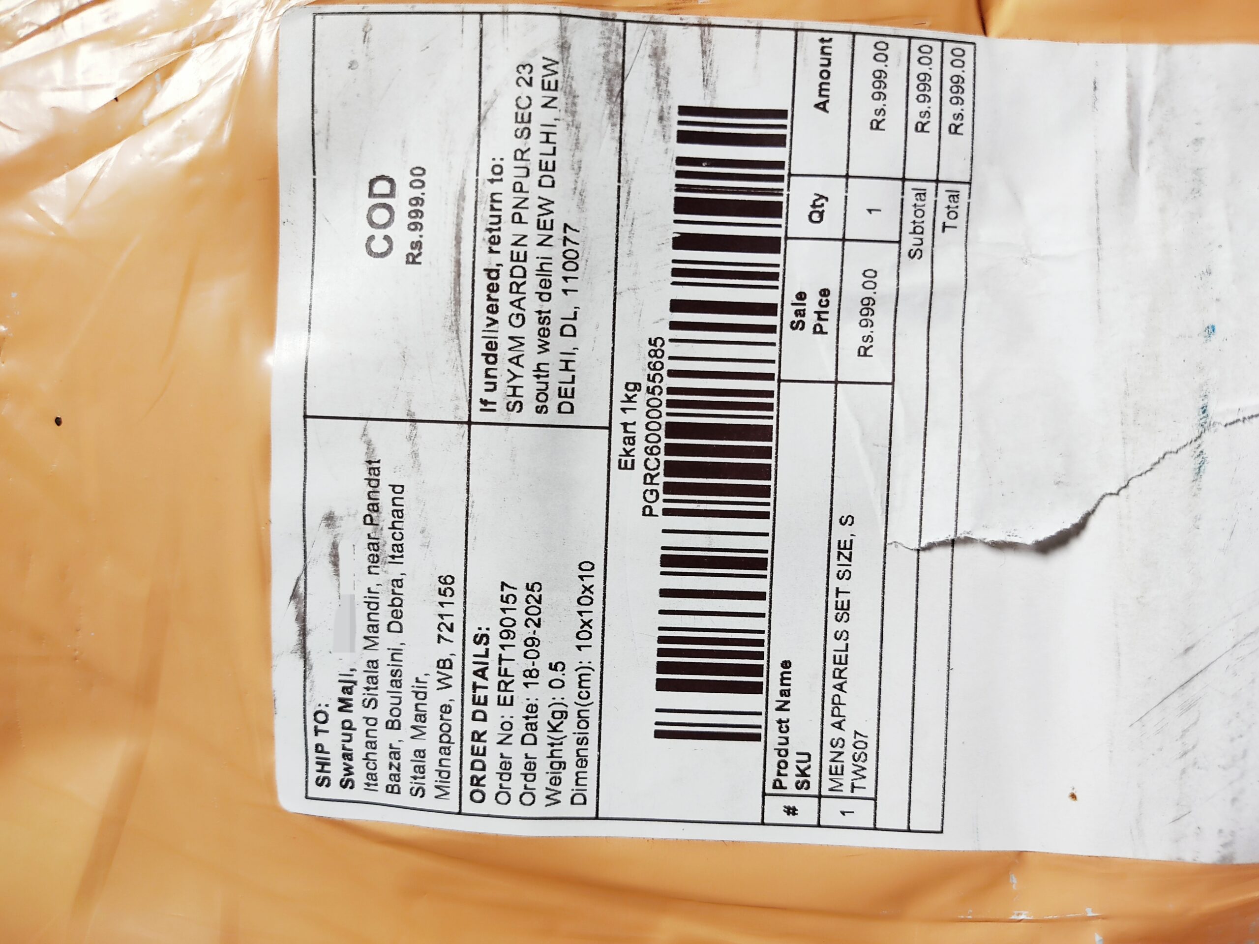 Online Lilen shirt ordered. At the time of order it was showing 3 no of Lilen shirt size XL of Rs. 999/- and subsequently I have ordered on COD basis. I have received a message from Ekart updates with tracking ID PGRC6000055685 from Parcelgator will be delivered on 22.09.2025. I have received the percel and paid Rs. 999/- to the delivery boy vide his mobile No. 07314375777. The vendor is a fraud and deliver wrong materials. The address of the vendor mentioned in the envelop is