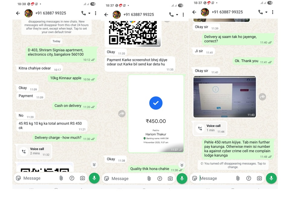 I have enquired online with IndiaMart about online fresh Apple fruit from Kinnaur. Got a response from +916388799325. He mentioned apple will be delivered to my home in a day. Immediately after payment, he mentioned that price got reduced. So, I need to pay the reduced price amount and he’ll refund the previous one. While pressing him for giving the delivery in higher price, whole communication got stopped. Later on he deleted all whatsapp msgs, but I have all screenshots.