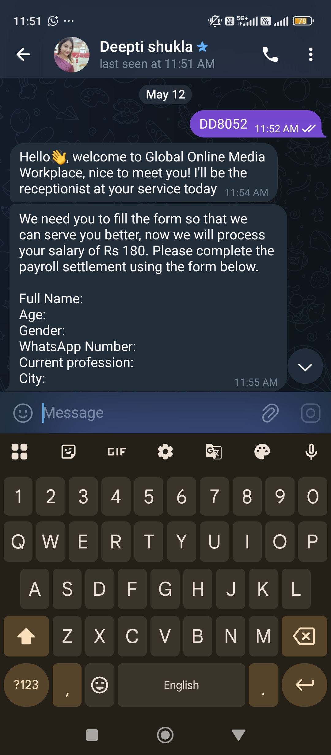 Myself pallavi got work at home offer in facebook from global media online workplace they said to task s on phone (telegram platform), one staff says just to see videos sent by them and take screenshot and send it, took my bank details and credit 1 hundred something in my account.. Next day mission is 16 video screenshot and 4 tasks.. In first task I have send 300 rupees and return 390 in my account next I give 3000 return 3900..then the next task they say deposite 30000 and return 39000, I have deposit 30000 and they says task is wrong and frozen my account then they says pay 50000 to unfrozen the account and credited 103900 in your account. Then I paid 50000. Again they says this money not enough to unfrozen and pay 100000 after paying this amount you will get 2 lakh something that time I understood its fraud and I am not ready to pay . So again frozen my account.. I lost almost 80000 rupees.. What I do to return my money.. I am borrowing money from my friends.. Now I am not return money to my friends.. Please help..