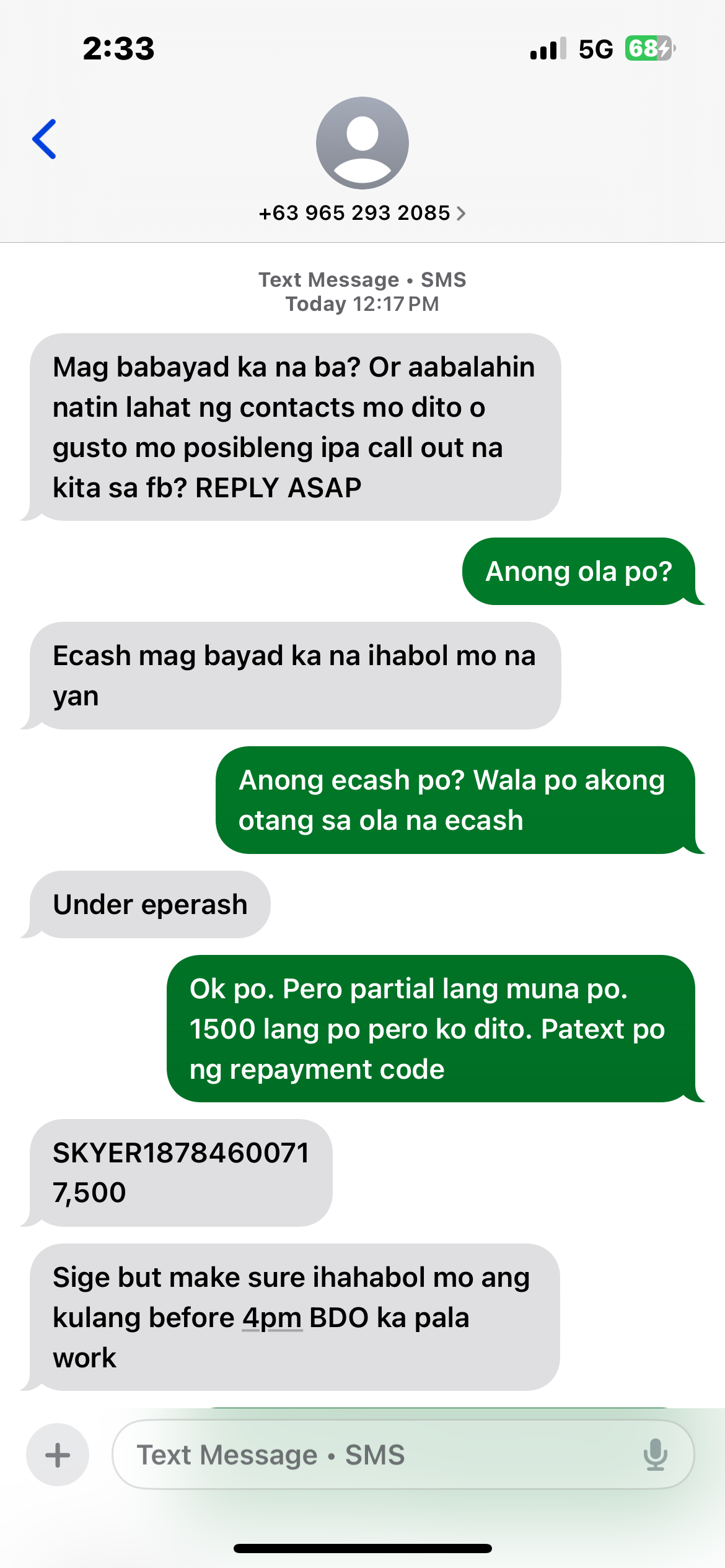 I would like to complaint regaridng this OLA EPERASH. They are harassing me and texting me to call my company. They even threatened me to post my identity in social media. I already paid enough interest but they keep harassing me. They even include my company in harassment.