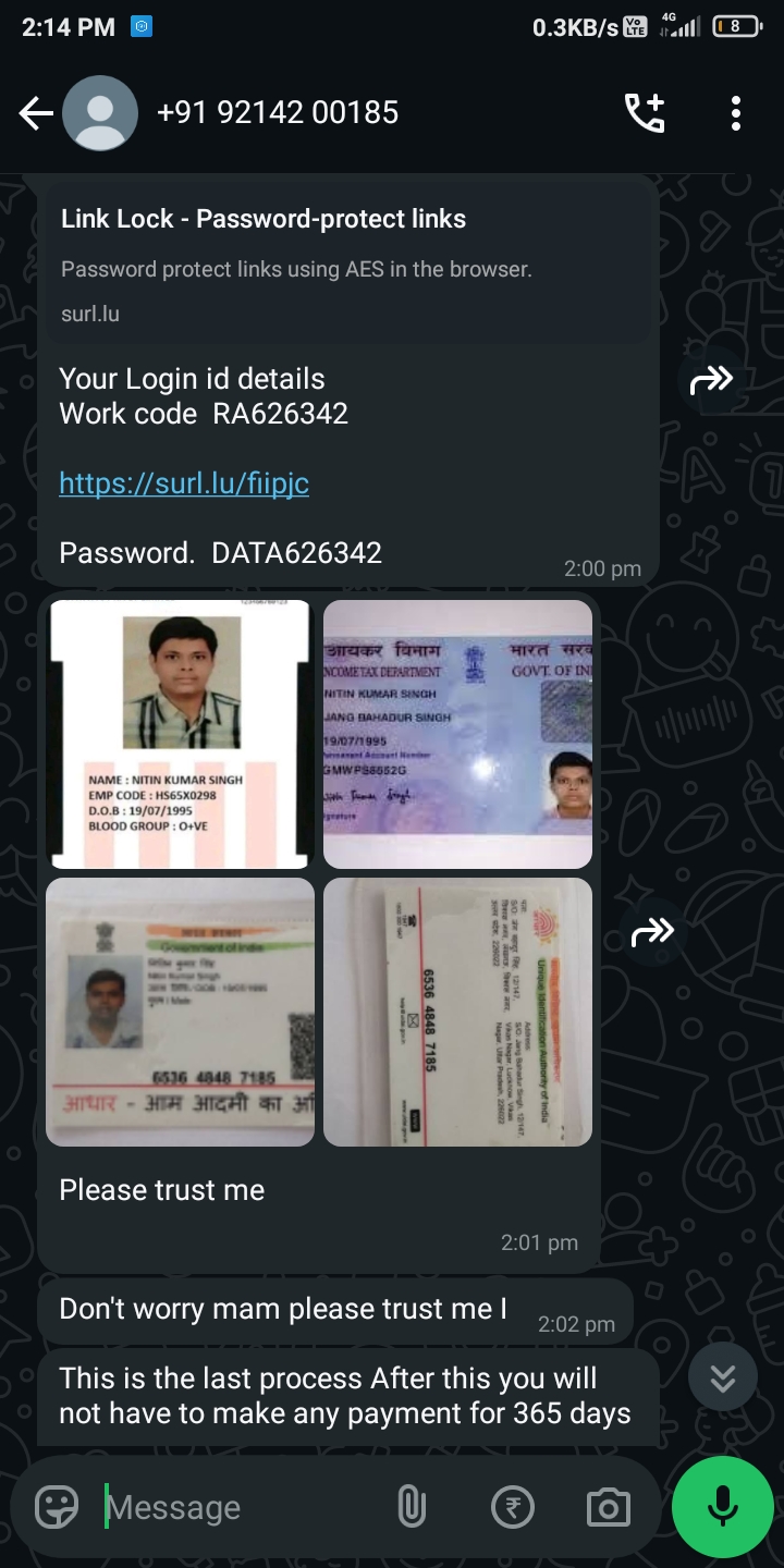 Phle inhone kaha 200 rupaye do kaam start krne ke liye, pay krdiye, fer 500 diye, fer unhone kaha login I’d password mil jayega, dusra number de Diya, dusre number se 2000 maangne lgg gye, mujhe shakk hua, or inhone apna pan card adhaar card vgera bheja or Mane scan krke dekha toh ye log fraud the or farji the, logon se paise loot te hai, so pleaseee all of you be aware from these kind of frauds !!!