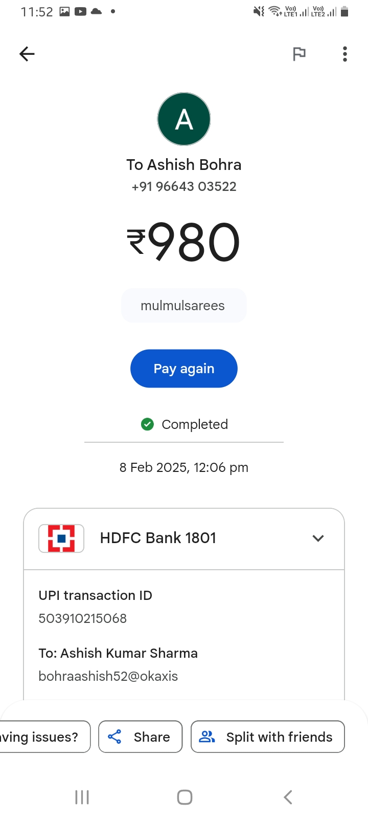 I have seen whatsapp post and confirmed by company name and ordered 2 mulmul sarees each cost Rs.490 and have sent total amount Rs.980 on February 8th and Ashish Bohra whose number is attached is not responding from then and had not sent me product. I am verbally abused by all my family members for losing money. Please take proper action and make refund of my money.