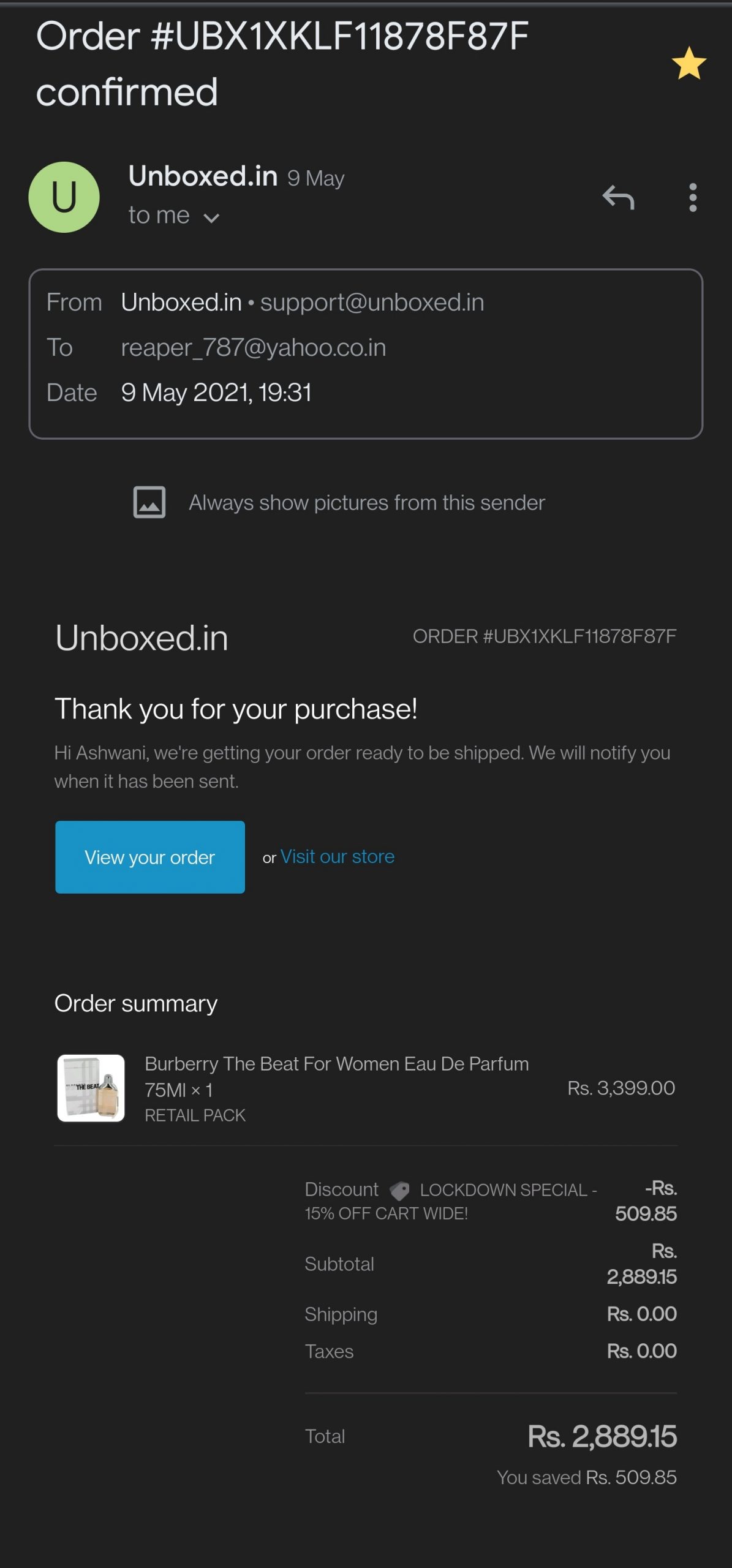 I purchased perfume “The Beat by Burberry” on website www.unboxed.in on 09.05.2021. The payment of 2889.15 was made at 19.31, but till date they haven’t delivered the product and nor has my money been refunded.