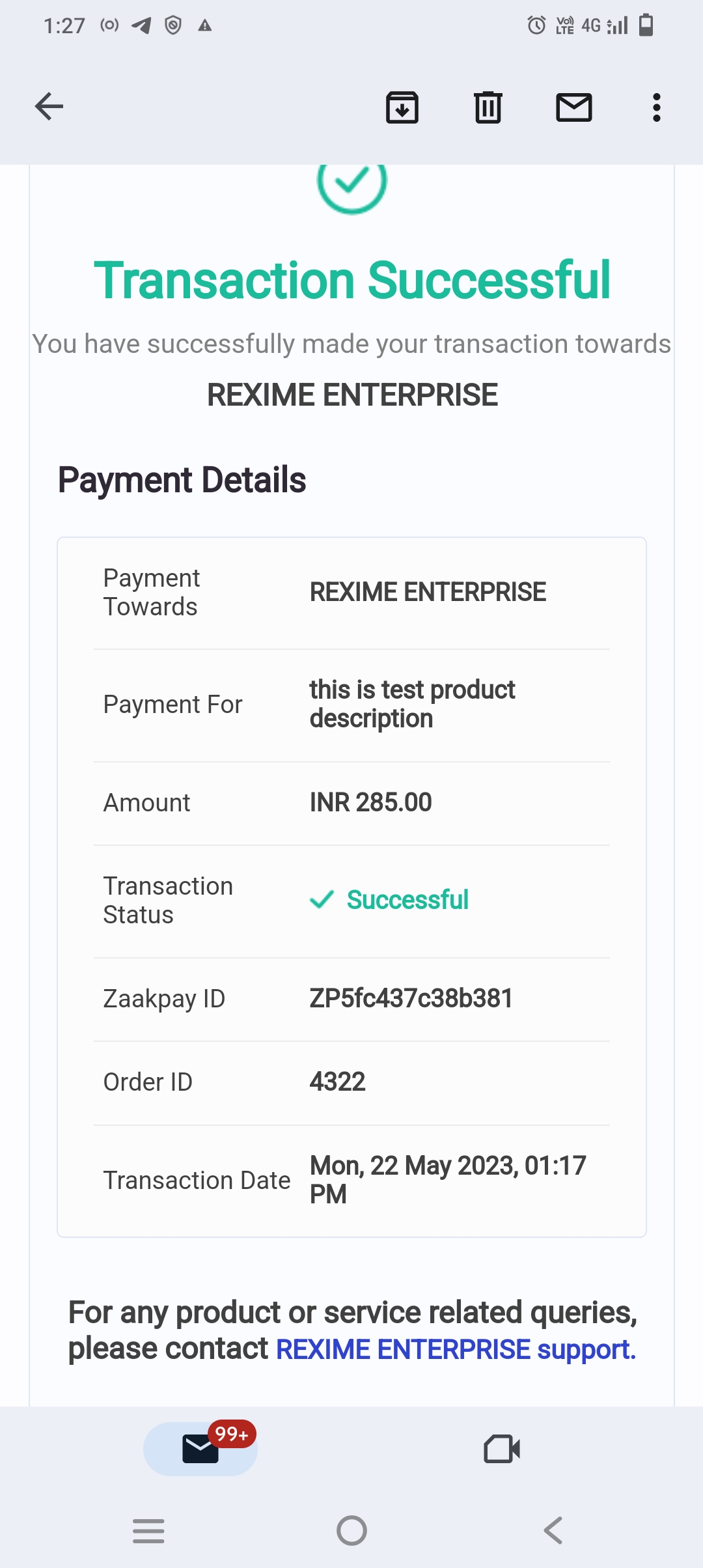 I have placed an order no. 4322 on dated Mon, 22 May 2023, 01:17 PM & made a payment of Rs.285/- through paytm to a co. namely Shopilaza Shop & payee is shown is Rexime Enterprise phone pe but after carefully looking more about the company I have found that I have been cheated by the company neither delivered the order nor there was an option to refund therein on the company portal.