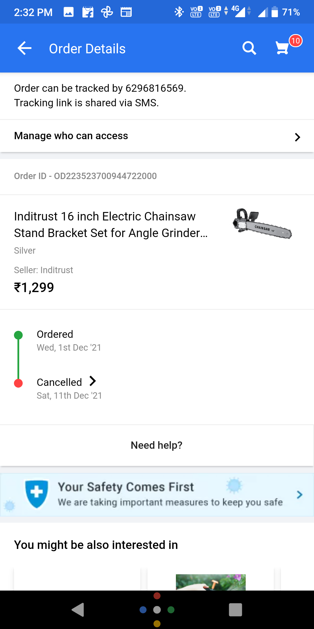 I am Order a electric chainsaw Order ID – OD223523700944722000 on 1 St December . delivery date is 10 December but it is not delivered.so I cancelled my order 11 December then Flipkart saw me my refund date 22 December but after many complain not refund 1299 ₹ amount of product to day date 5 January